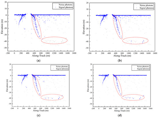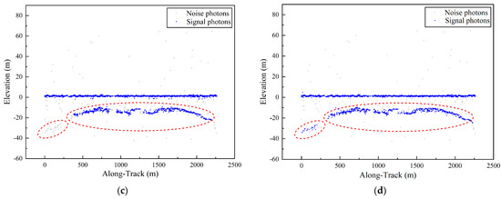 Comparison of Huaguang Reef denoising results in 15 July 2022. (a) ATL03 results. (b) DBSCAN results. (c) Quadtree results. (d) Results of the proposed method.