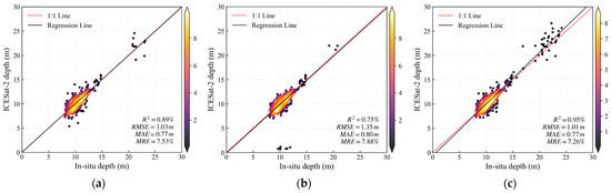 Scatterplots of ICESat-2 extracted depth and in situ depth for different algorithms. (a) DBSCAN; (b) Quadtree; (c) The proposed method.