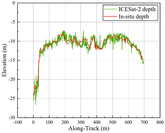 Figure 17 shows the data fitting results of the proposed method and the in situ bathymetry data. The experimental results indicate that the ICESat-2 sounding data after refractive index correction obtained by the proposed method align closely with the in situ sounding data, effectively displaying the underwater terrain contour information and providing a foundation for subsequent experiments.