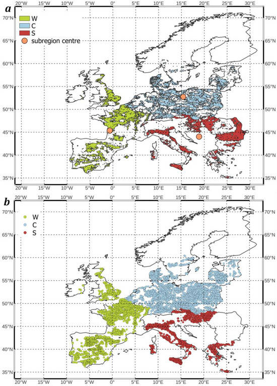 The study area covers arable land in the European Union, associated countries (Norway, Switzerland), and the United Kingdom (UK) in 2020–2021 (Supplementary Materials). The land was examined within the contours of the ‘croplands’ category of the analyzed land-cover map in three separate agricultural subregions: western (W), central (C), and southern (S). W includes the croplands of France, Ireland, Portugal, Spain, and the UK; C—Belgium, Denmark, Estonia, Finland, Germany, Latvia, Lithuania, Luxembourg, the Netherlands, Norway, and Sweden; and S—Austria, Bulgaria, Greece, Croatia, Cyprus, Hungary, Italy, Malta, Romania, Slovenia, and Switzerland (Figure 1a). The location of the samples of the main soil groups of the World Reference Base [30] units used to characterize arable land within croplands in each subregion are shown in Figure 1b. The selected subregions were restricted to the croplands within them (Figure 1b). Soils of arable land were characterized using the main soil groups of World Reference Base (WRB) units, which occupy an area of at least 4% of each subregion (Table 1).