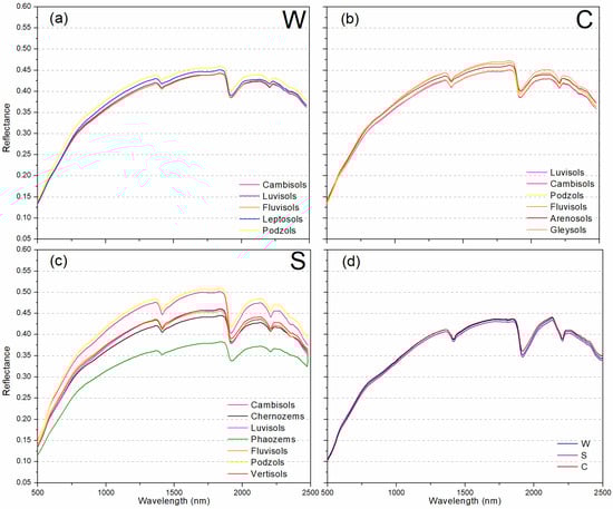 The greatest diversity of the reflectance spectra of soil samples for soil units collected within the studied subregions, was found in the S subregion. The lowest reflectance was determined for the dark-colored Phaeozems and Chernozems, developed there from SICL and SIL, with a relatively high average SOC content (about 2%) and a relatively high (4–5%) average CaCO3 content, which, at these levels, contribute to increasing the roughness of their surfaces (Figure 2). Meanwhile, the lowest reflectance was determined for light-colored Cambisols, developed from CL, covering almost one third of the surface of this subregion, with a low average SOC content (about 1.5%), but the highest average CaCO3 content (over 9%) among the analyzed soil units, which, however, should not increase the reflectance of these soils (Table 2). The smallest difference in reflectance can be seen between the main groups in W, where the spectra of two large-area soil units (Cambisols and Luvisols) are characterized by the similar average (approximately 1.5%) SOC content.