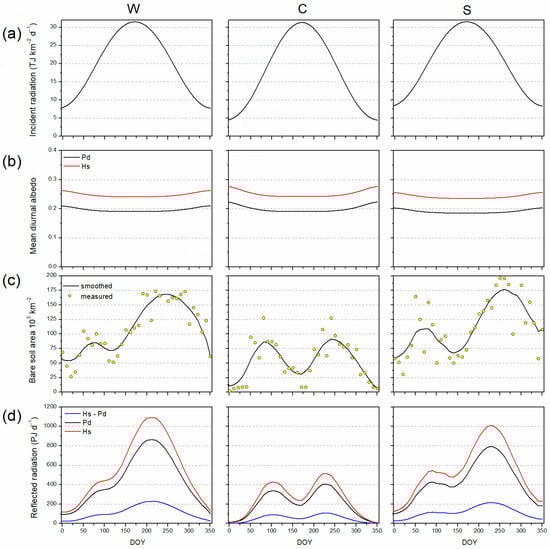 Annual variations within analyzed subregions in (a) amount of shortwave radiation reaching the land in clear-sky conditions; (b) average diurnal blue-sky albedo (αd) of the average air-dried surfaces of bare land formed by a plow (Pd), and smoothing harrow (Hs); (c) areas of bare arable land; and (d) amount of shortwave radiation reflected under clear-sky conditions from air-dried surfaces of the land shaped by a Pd and Hs and amount of this radiation resulting of smoothing the land by a Hs previously treated Pd. DOY—day of the year.