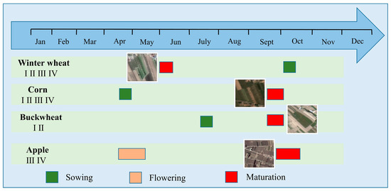 The spatial distribution of precipitation in the Loess Plateau of eastern Gansu Province is characterized by more precipitation in the southeast and less in the northwest. As a result, the spatial distribution of crop planting structures also follows certain rules, with buckwheat and other typical crops tolerant to cold and drought distributed in the northwest, and apples and winter wheat in the southeast [37]. Phenology refers to different growth periods of crops in the growing season, during which the growth state and physiological characteristics of crops are translated to different remote sensing features. These features include reflectivity, the vegetation index, etc., which can be used for the recognition of different types of crops [38]. Therefore, in crop classification and recognition, the accuracy and reliability of crop classification can be improved by using phenological changes. Under the double effect of the climate and the crop cycle, different crops vary greatly in phenological periods. To name a few, winter wheat is usually sown in mid-September and ripened in late June of the following year. Corn is sown in mid-April and ripened in late September. Buckwheat is sown in mid-July and ripened in early September. Apples blossom in April–May and ripen in September–October (Figure 2).