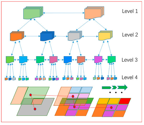 Hierarchical network diagram of imaging objects, with different colors representing different types of ground objects.