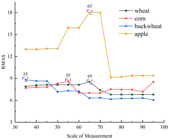 The RMAS values of different crops. (The optimal segmentation scale is 35 for buckwheat, 65 for wheat and apples, and 55 for corn).