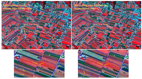 The segmentation map before and after integrating edge information. (The arrows indicate that more detailed objects are segmented after integrating edge information).
