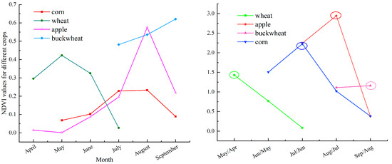 This study gathered the statistics of the NDVI values of different crops and the NDVI ratios of adjacent months to understand the growth statuses and changes of crops. The changing trend of the NDVI and the month with the largest change rate were used as reference images for crop classification. As indicated by statistical calculation (Figure 8), the reference images of wheat, corn, apples, and buckwheat were selected in May, July, August, and September, respectively. On this basis, the NDVI ratios in different phenological periods were used as feature factors to facilitate the classification and interpretation of crops and improve classification accuracy.