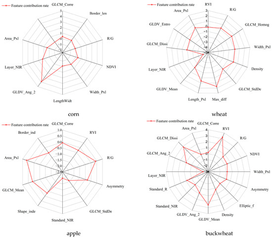 Statistics show that the number of feature factors after optimization for the four crops is greatly reduced, with texture and spectral features accounting for a large proportion, followed by geometric and exponential features. The number of feature factors selected for corn, wheat, apple and buckwheat are 9, 12, 10, and 16, respectively. As shown in Figure 9, corn has a total of nine auxiliary feature factors, dominated by texture and spectral feature factors, namely GLDV_Ang_2 and Mean_NIR, with weights of 3.89 and 1.24, respectively. Since corn ripens mainly in July and August, during this period, corn appears as a deep red false-color image with obvious texture features. GLCM Ang. 2nd Moment reflects the uniformity of the texture in the image and can be used as a cofactor to identify corn crops along with the reflection characteristics of the near-infrared band. There are a total of 13 auxiliary classification feature factors for wheat, dominated by spectral and texture factors. Its main spectral features include Mean_NIR and Max_diff, with weights of −3.95 and 1.69, respectively. During the growing season of wheat, which mainly ranges from March to May, wheat appears to be light red in color and has an even texture, making it easier to distinguish than other crops. In addition to using high near-infrared band characteristics, we can effectively support wheat classification by using the maximum band difference value. The texture features are mainly the GLDV_Mean_ with a weight of −1.18. The features of apples are dominated by GLCM_StdDe and Standard_NIR, with weights of −1.61 and −1.97, respectively. During the growing season of apples, which mainly ranges from August to September, the texture of apples is more significant than other crop features, and the changes in band standard deviation provide a good reflection of the information on apples. The dominant factors of buckwheat are the RVI, GLDV_Mean_, Layer_NIR, and GLCM_Dissi, with weights of 3.23, 2.54, −2.14, and 2.82, respectively. This is because buckwheat mainly ripens in September and October, which is also the ripening season of apple and corn. Buckwheat, on the other hand, is more delicate in texture than other crops, appearing pink in false-color images, while other crops appear darker. The RVI, which reflects the growth state of crops, has the highest weight. Additionally, the Mean_NIR among spectral features is more effective in classification because the reflectance of crops is usually higher in near-infrared bands.