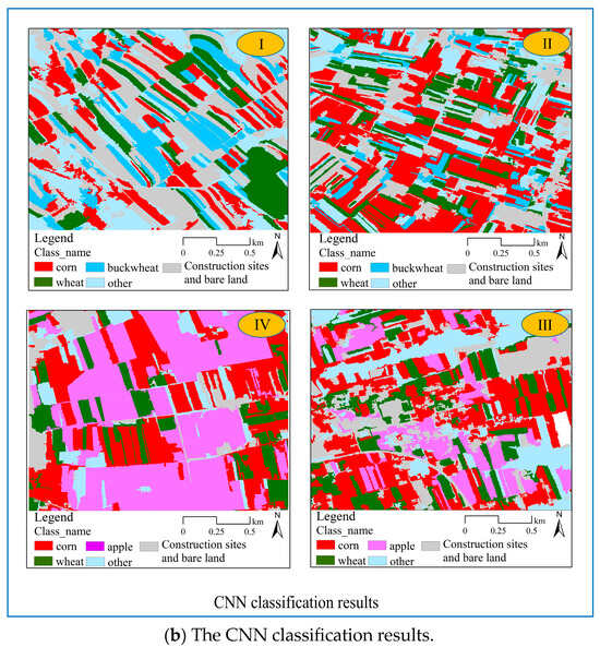 According to Table 3, both the RF and CNN show high accuracy in classifying crops in test area I. Overall, regardless of the Kappa coefficient or the overall classification accuracy, the classification results obtained by the RF model are higher than those obtained by the CNN model in the four test areas. In test area I, the Kappa coefficient calculated for each crop category is higher for the RF model than for the CNN model. Overall, the Kappa coefficients calculated by the RF model and the CNN model are 0.89 and 0.87, respectively. The overall accuracy calculated by both models exceeds 90%. Test areas II and I have the same crop categories, but the former has a smaller planting area of buckwheat than the latter. The Kappa coefficient for buckwheat classification by both models is smaller than that for the other two crops because buckwheat is planted in a small area with insufficient training samples. Due to the small number of samples, model overfitting occurs, resulting in low accuracy [59]. However, both the RF and CNN models have high overall classification accuracies, reaching 94.92% and 93.43%, respectively. Test areas III and IV dominated by wheat, corn, and apples feature high overall classification accuracies. In test area III, the overall classification accuracy of the RF and CNN models reached 89.37% and 88.94%, respectively, while in test area IV, the accuracy was 90.68% and 90.18%, respectively.