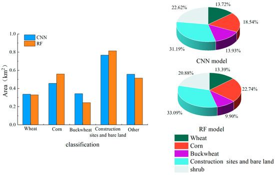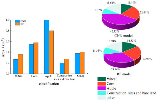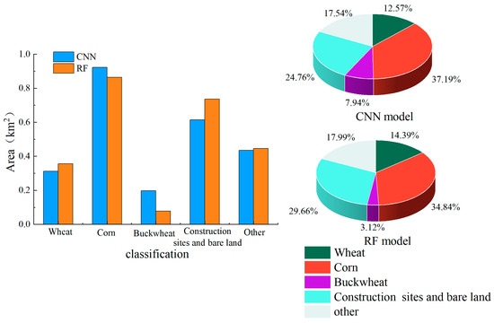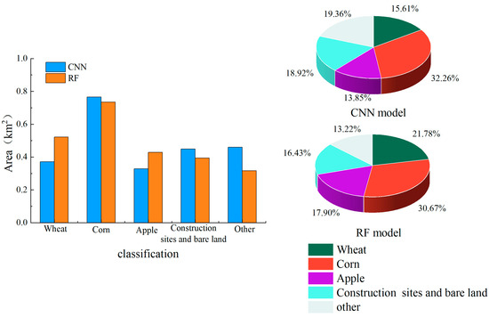 This paper conducts a comparative analysis of the accuracy of the results using the two methods and provides statistics on the area and proportion of four test areas (Figure 11, Figure 12, Figure 13 and Figure 14). In the test area I, among wheat, corn, and buckwheat, corn has the largest planting area in the classification results. The classification area of the RF model is 0.56 km2, accounting for 22.74%, and that of the CNN model is 0.46 km2, accounting for 18.54%. The test area II has the same crop planting structure as test area I. Similarly, corn has the largest area in the classification results. The corn area classified using the RF model is 0.86 km2, accounting for 34.84%, and that of the CNN model is 0.92 km2, accounting for 37.19%. Buckwheat has the smallest area, with the area classified by the RF and CNN models being 0.08 km2 and 0.20 km2, accounting for 3.12% and 7.94%, respectively. In test area III, corn has the largest area compared to any other crop. The area classified by the RF and CNN models is 0.73 km2 and 0.77 km2, respectively, The area of apples classified using these two models is 0.43 km2 and 0.33 km2, respectively. In the results of the two models, the area of corn classified by the RF model is larger than that of the CNN model, while the area of apples classified by the RF model is smaller than that of the CNN model. According to field investigation statistics, there are more planting structures of corn and apples in this area. The main reason is that both corn and apples mature in August and September, and appear similarly in false-color remote sensing images during this period. Compared with the RF model, the CNN model can better adapt to complex data patterns. In addition to the crops studied, other vegetation also exists in the test area. Due to the interference of diverse and complex vegetation in the classification process, the RF model is not as effective in fully classifying crops. In test area IV, apples have the largest area. The area classified by the RF and CNN is 0.80 km2 and 1.02 km2, respectively. As can be seen from the classification result graph, the area of independent apple blocks classified by the CNN model is larger. According to field investigation and the interpretation of remote sensing image satellites, the planting structures in this test area were regularly distributed in blocks. As the CNN model grouped adjacent crops into a unified entirety, this may be the main reason why the CNN model has a larger classification area for apples than the RF model. Overall, the classification results of four test areas vary as two models use different algorithms. The difference is particularly significant in the test areas where corn and apples are planted. However, in terms of the spatial distribution and quantity classification of crops, the classification results of the CNN model and the RF model are highly consistent and integral.