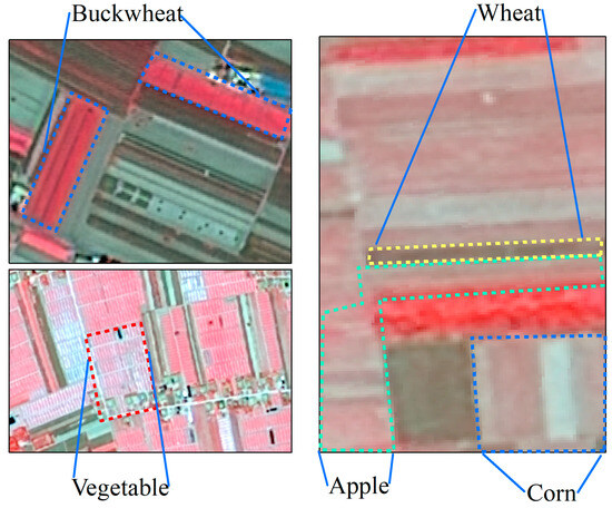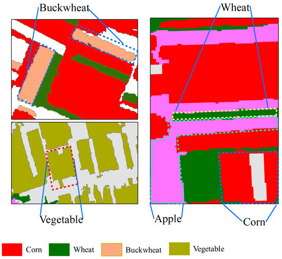 Crop classification methods based on object features mainly include pixel-level classification and object-based image classification. Pixel-level classification focuses on locality and ignores the correlation between objects. Salt-and-pepper noise due to the spectrum difference of in-class pixels and “mixed pixels” resulting from the interclass pixel proximity effect have compromised the classification accuracy of crops significantly, making it difficult to meet the need for practical applications [16,17]. With the segmented object as its basic unit, object-based image classification is more targeted and has the advantages of reducing the amount of data involved in the operation, smoothening the image noise, and further collecting crop information to classify by introducing the features of the object shape, texture, etc. For example, Su et al. [23] made full use of 58 spatial feature factors of crops, and completed the high-precision classification of crops in the region using the object-based image classification method. Karimi et al. [24] enabled high-precision crop classification of multi-temporal Landsat remote sensing images with the object-oriented classification method. Common crop remote sensing classifiers include, but are not limited to, Maximum Likelihood Method, Support Vector Machine (SVM), and Random Forest [25,26,27]. In recent years, deep learning has gradually become the mainstream algorithm in the image pattern recognition area by virtue of its hierarchical representation of features, efficient operation, and end-to-end automatic learning [28,29]. The Convolutional Neural Network (CNN), as one of the fastest-developing algorithms in deep learning, has been widely used in the crop classification task [30]. Both models demonstrate good applicability in interpreting crop planting structures, and the classification results largely correspond to the actual distribution. The classification results exhibit good separability, with fewer instances of misclassification and omission, allowing for better a extraction of crop information in areas with higher heterogeneity.