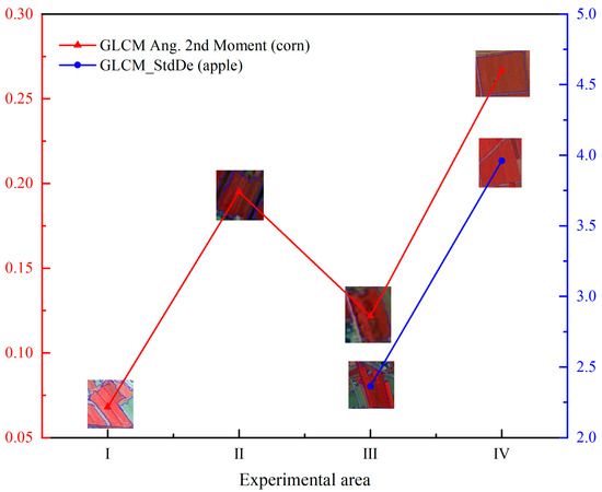 Due to the similar false-color images of corn and apples, the texture features of both crops occupy a high proportion in the feature factors. According to the statistics of the GLCM Ang. 2nd Moment feature factor values of corn in the four test areas (Figure 17), test area I has the smallest value, and test area IV has the largest. This is because the Loess Plateau of eastern Gansu Province is a rain-fed crop area with better soil quality and fertility than the northwest region, creating better conditions for crop growth and resulting in larger single-crop areas in the southeast. Therefore, the area of a single corn block in test area I is smaller than that in test area IV. The larger block contains more surface details and texture information, making the texture features rougher [71,72]. Test area II shows consistency with test area III in terms of its size and has a corn area slightly smaller than that in test area III, resulting in a slightly larger feature factor value. The dominant texture feature factor of apples is GLCM_StdDe. Similarly, test area IV has more pixels, with a significant difference in texture features, and a relatively large standard deviation. Hence, the texture feature value of test area IV is larger than that of test area III.
