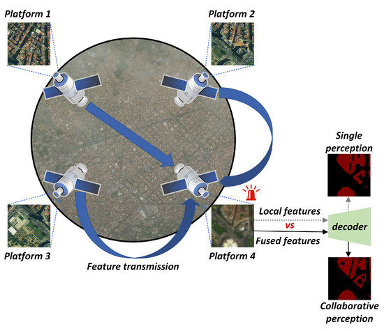 Illustration of multiple remote sensing platforms’ collaborative perception. The members of the collaborative group can enhance their local perception with the help of collaborative information from other platforms.