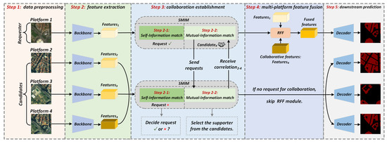 With the advancement of edge intelligence, remote sensing intelligent interpretation has demonstrated exceptional performance in onboard real-time processing tasks, which has been applied in disaster detection [1,2], maritime monitoring [3,4,5], and urban mapping [6,7]. However, the individual platform faces inherent limitations, such as the restricted observation range, along with challenges like occlusion [8] and image degradation [9,10]. These issues result in incomplete data acquisition, significantly hampering the platform’s perception performance.