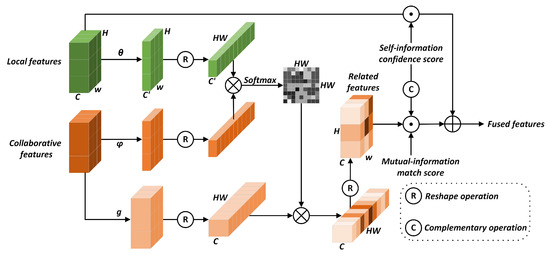 To address these issues, we designed the RFF module, inspired by nonlocal attention [61], to help DCP-Net achieve multiplatform global feature interaction. The RFF module initially utilizes the requester’s features as a reference to select the correlated portion of the collaborative feature. Subsequently, it fuses these processed features with self-information confidence scores and mutual information match scores. The integration captures the intricate interdependencies between the feature sequences, for more accurate and efficient feature fusion. For a comprehensive understanding, the implementation details for the RFF module are exhibited in Figure 5.