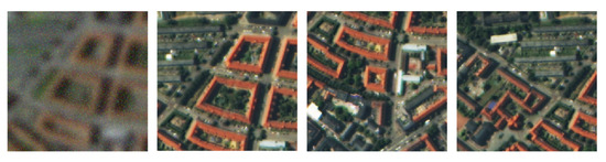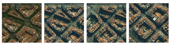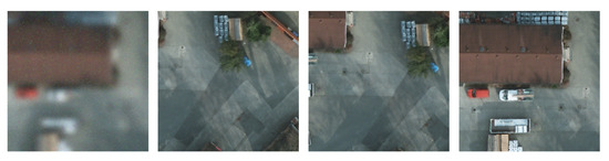 Firstly, a full-size remote sensing image is cropped into multiple subsets of size 1024 × 1024 by sliding windows. Secondly, four observation views of size 512 × 512 are randomly extracted from each 1024 × 1024 subset. By implementing these steps, a collection of images with overlapping observation ranges of identical scenes is obtained, simulating the observation of the same scene by four platforms. Figure 6 and Figure 7 below visually illustrate the resulting simulated datasets.