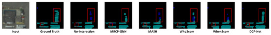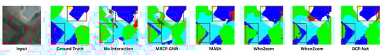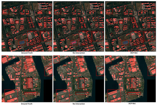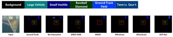 In the multiplatform iSAID dataset of both modes, it is more challenging to discriminate 16 classes, particularly in a lower resolution. For clarity, only six classes are visualized. Due to the incomplete representation, No-Interaction often mistakes some large vehicles for the small ones in Figure 21 and directly ignores some tiny objects, such as the small vehicles in Figure 22. In contrast to other methods, DCP-Net can remedy the issues mentioned above better and provide a more accurate regional prediction.