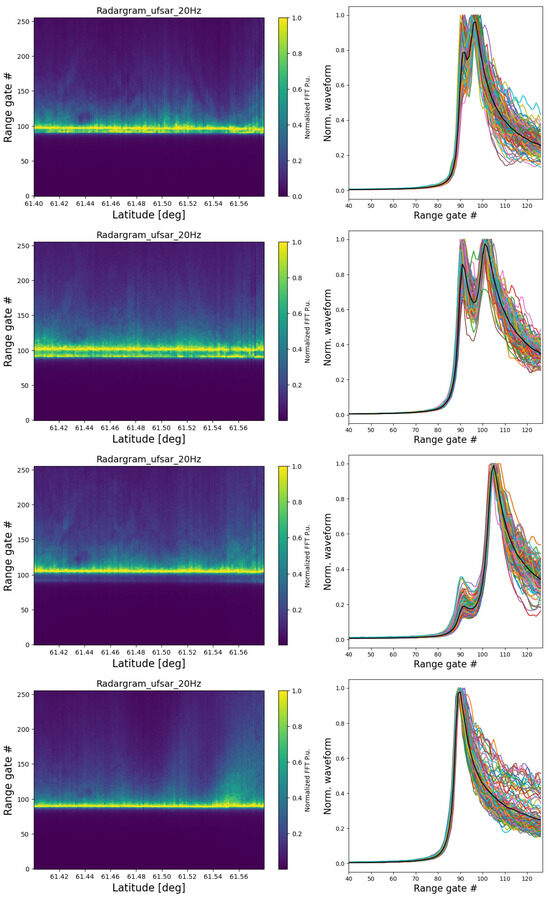 Illustration of the evolution of the bimodal lake ice thickness signature in Sentinel-6 UFSAR radargrams (left column) and the normalized waveforms (right column) at 20 Hz resolution at Great Slave Lake in December 2021 (top), February 2021 (second row), end of April 2021 (third row), and May 2021 (bottom). The black line in the plots of the right column corresponds to the mean waveform in the selected region of the lake.