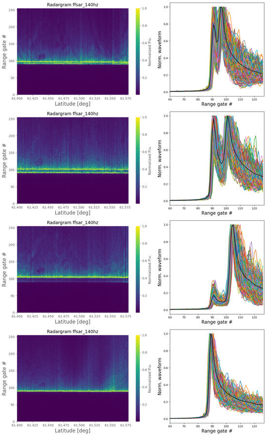 Illustration of the evolution of the bimodal lake ice thickness signature in Sentinel-6 FFSAR radargrams (left column) and the normalized waveforms (right column) at 140 Hz posting rate at Great Slave Lake in December 2021 (top), February 2021 (second row), end of April 2021 (third row), and May 2021 (bottom). The black line in the plots of the right column corresponds to the mean waveform in the selected region of the lake.