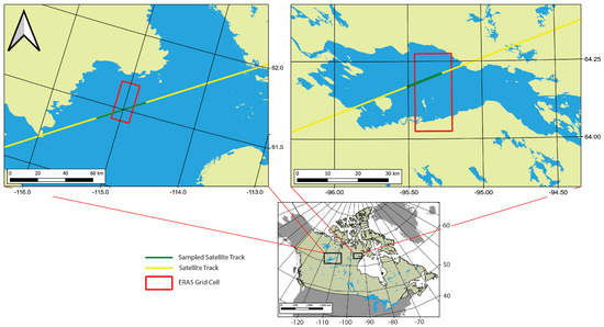 The target lakes of the LIT analysis, Great Slave Lake and Baker Lake, Canada, are shown on the map (bottom) and with the satellite ground tracks superimposed on the lakes (upper left and right, respectively).