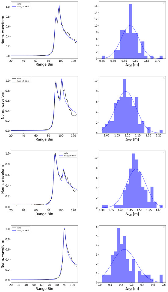 Examples of Sentinel-6 UFSAR waveform with, in blue, the SAR_LIT fit (left column) and LIT histograms, with the corresponding Gaussian fits (right column), in the RoI of Great Slave Lake at the end of December 2020 (top row), in February 2021 (second row), in April 2021 (third row), and mid-May 2021 (bottom row).