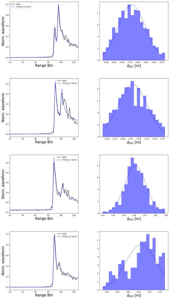 Examples of Sentinel-6 FFSAR waveforms with, in blue, the FFSAR_LIT fit (left column) and LIT histograms, with the corresponding Gaussian fits (right column), in the RoI of Great Slave Lake at the end of December 2020 (top row), in February 2021 (second row), in April 2021 (third row), and mid-May 2021 (bottom row).