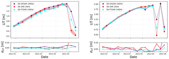 Comparison of the LIT estimates obtained with Sentinel-6 high-resolution SAR data for one ice season at Great Slave Lake (left) and Baker Lake (right). The curves refer to UFSAR at 20 Hz (red), UFSAR at 140 Hz (purple), and FFSAR at 140 Hz (cyan).