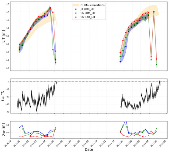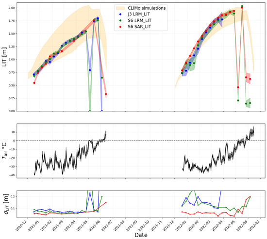 Evolution of LIT estimates at Great Slave Lake obtained with Sentinel-6 UFSAR at 20 Hz data (red), Sentinel-6 LRM data (green) and Jason-3 data (blue) for the 2020–2021 and 2021–2022 ice seasons (upper panel). The shaded regions of the corresponding colors refer to the LIT error envelopes at 1 for each case. The orange shaded area shows the evolution of LIT obtained from CLIMo thermodynamic simulations with different on-ice snow scenarios (see text in Section 4.3 for details). The middle panel shows the evolution of the mean 2 m air temperature (black) with the minimum and maximum values (gray shading) extracted from ERA5 data. The bottom panel shows the evolution of the 1 LIT uncertainties for the three datasets.