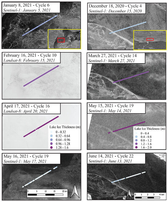 Finally, we performed consistency checks by superimposing the LIT estimates obtained with the SAR_LIT retracker applied to Sentinel-6 20 Hz UFSAR data onto optical (Landsat-8) or radar (Sentinel-1) images, according to the images availability on the Sentinel-6 flyover dates over the two lakes. This is illustrated in Figure 10 for Great Slave Lake (left) and Baker Lake (right), where the Sentinel-6 LIT estimates along the ROI track segment are overlaid on the images and color coded, ranging from 0 to 1.6 m for Great Slave and from 0 to 2 m for Baker. The images and LIT estimates are shown for representative dates following the typical duration of the ice season for the two lake targets, from January to May for the Great Slave lake and from December to June for the Baker lake. Overall, there is a very good consistency between the LIT estimates and the lake surface conditions for both target lakes, with thinner ice detection at the beginning of the ice season when the images show a heterogeneous surface of initial ice formation and open water (top panels), consistently growing LIT in the middle of the ice season when the snow/ice cover uniform over the lake surface (second and third panels), and drop in the LIT estimates to small values at the end of the season with snow melt, as shown in the bottom panels.