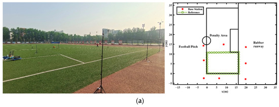 To validate the performance of the proposed method, four sets of UWB/INS (Inertial Navigation System) data collection experiments in different environments were arranged on the campus of the China University of Geosciences Beijing by using the Link Track UWB sensors (Table 1) which is provided by the Nooploop company (https://www.nooploop.com, accessed on 26 April 2024), including a dynamic test in an open outdoor environment (Figure 2a), a dynamic test in an indoor–outdoor transition area (Figure 2b), a dynamic test in a complex indoor environment (Figure 2c), and a static test in an outdoor open-sky environment (Figure 2d). As is shown in Figure 2, the experiment environments and the sketch maps of the exhibition of these four tests are presented. Here, the static experiment was to verify the existence of a UWB ranging error, and the three dynamic tests were to validate the effectiveness of the proposed methods on the UWB positioning performance in terms of accuracy and smoothness. The dynamic test in an outdoor environment is mainly to validate enhancements in the ranging offset calibration and the moving average filter because no NLOS errors exist here. The dynamic tests in the indoor and indoor–outdoor transition area environments are mainly to validate enhancements in the ranging offset calibration and the prior residual-based robust algorithm. During each test, certain epochs at the beginning or end were to collect the static UWB data that were used to calculate the UWB ranging offsets.