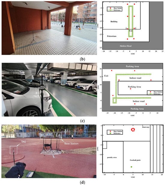 UWB experiments environments and the sketch maps of the exhibitions. (a) Outdoor environment. (b) Transition area. (c) Indoor environment. (d) UWB ranging offset existence test.