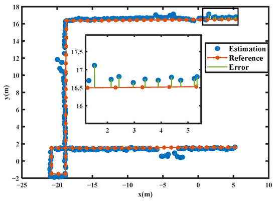 During each test, nine UWB hardware were used, wherein eight of them were used as base stations and marked as A0, A1, A2... A7. The left one was used as a user tag. The distributions of these UWB hardware are shown in Figure 2. As is shown, due to the poor observabilities in the indoor and indoor–outdoor transition area environments, it is impossible to evaluate the UWB positioning accuracy through GNSS solutions. Meanwhile, since the standard deviation obtained based on parameter estimation is an internal coincidence accuracy index, it cannot reflect the actual positioning accuracy. Therefore, this paper uses a total station to measure the 3D coordinates of the reference route with a distance interval of 1 m. Then, the 3D coordinates of the route can be calculated by using linear interpolation. Finally, we evaluate the UWB positioning accuracy by calculating the Euclidean distance from the UWB tag to the measured reference route. The principle of such an accuracy evaluation method of UWB positioning is illustrated in Figure 3. ‘Reference’ represents the coordinates on the reference route, ‘Estimation’ represents the UWB positioning results, and ‘Error’ represents the corresponding Euclidean distance. The position error can be defined by