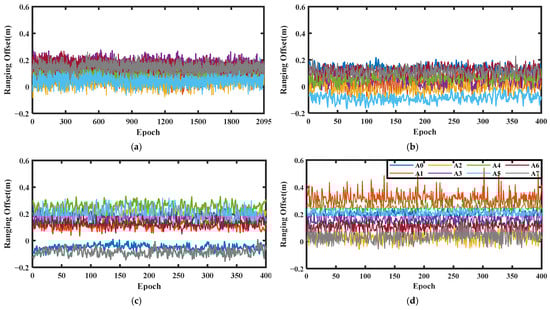 Ranging offset time series in different conditions. (a) Ranging offsets in the static test. (b) Ranging offsets in the outdoor environments. (c) Ranging offsets in the transition area. (d) Ranging offsets in the indoor environments.