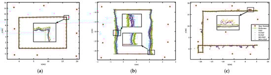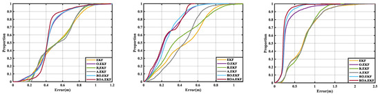 To further evaluate the impacts of each presented algorithm on UWB positioning accuracy, these collected UWB dynamic data are processed by conventional EKF, prior residual-based robust theory-augmented EKF (R.EKF), ranging offset calibrated-enhanced EKF (O.EKF), prior residual-based robust theory and ranging offset calibration-enhanced (RO.EKF), and moving average filter-enhanced RS.EKF (ROA.EKF), respectively. The corresponding results are displayed in Figure 7.