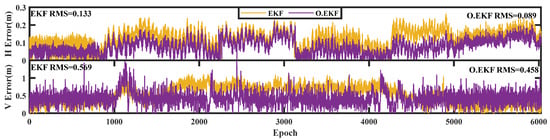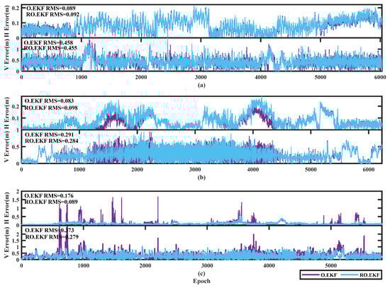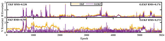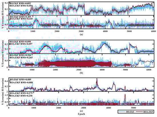 Obviously, it can be seen that the prior residual-based robust theory performs more visibly with existing poor-quality observations like in indoor environments. According to the statistical RMS values in Table 2, the position accuracy improvement percentages in the horizontal and vertical directions are 49.4% and 25.2% compared to the position errors with the ranging offset calibration-enhanced UWB (0.176 m and 0.373 m in horizontal and vertical directions) and with those of RO.EKF (0.089 m and 0.279 m in horizontal and vertical directions). The effect is rather clear in Figure 11c. However, in the transition area and outdoor conditions where there are high-quality observations, there are no significant improvements even in accuracy degradation. In fact, besides 2.4% position accuracy improvements in the vertical direction in the transition area, there are no more position accuracy improvements in such two environments.