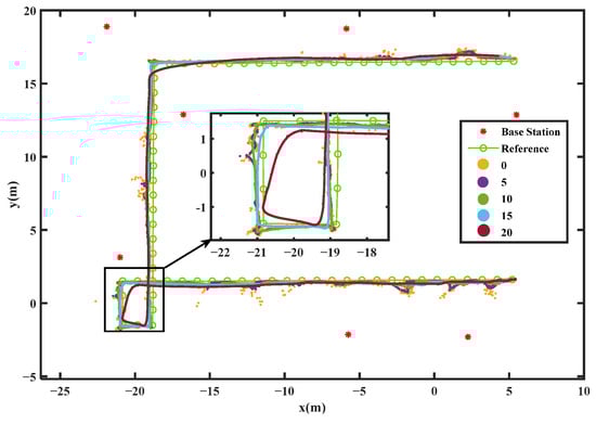 Before applying the moving average filter for denoising, it is necessary to set the window size. Shown in Figure 12 are the trajectories calculated by setting the window sizes to 5, 10, 15, and 20 epochs based on the data from the indoor test, and the corresponding positioning errors are plotted in Figure 13. According to the results based on different window sizes, it can be known that the smoothness is highly dependent on the window size. It demonstrates that a small window size would not take effect on denoising, and a large window size would make the observations at the current epoch heavily influenced by observations at previous epochs. Based on these results, this study ultimately selects a window size of 5 epochs for the moving average filter to denoise the UWB data.