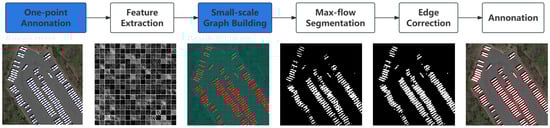 To alleviate the annotation burden of oriented small objects, we propose an innovative single-point-based annotation methodology, termed SPA. SPA relies on a single-point annotation to indicate object locations. As seen in Figure 1, the position of the point is not specified, which is more flexible and could reduce the manual work significantly. Then, the scale and the orientation angle of an object are determined via the proposed graph-based segmentation method [10,11,12], and which integrate the knowledge from both high-dimensional semantic features and hand-crafted local features, enabling precise identification and annotation of small objects in remote sensing images.