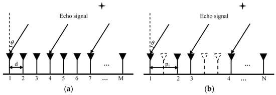 The structure of the array system: (a) ULA (b) SLA. (Asterisks represent targets, and arrows represent echo signals).