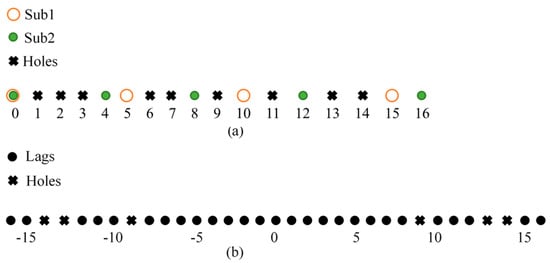 Thus, the difference set formed by any two elements in the array can be defined as , where elements in this set are also referred to as “lags” in the constructed difference co-array. Elements not included in this set (up to the maximum element in the set) are termed as “holes”. Generally, by vectorizing the covariance matrix , removing redundancy, and rearranging elements, the virtual received signal corresponding to the difference co-array can be obtained as [50]