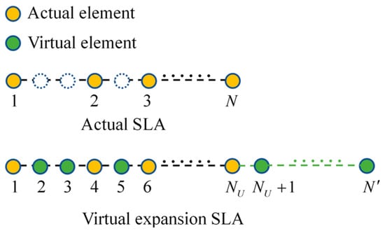 The proposed method for virtual aperture extension of arrays can be regarded as extending elements of a physical ULA, with the inter-element spacing , to elements, as illustrated in the schematic shown in Figure 3. The covariance matrix of the array output after extension still satisfies the Toeplitz property and can be represented as