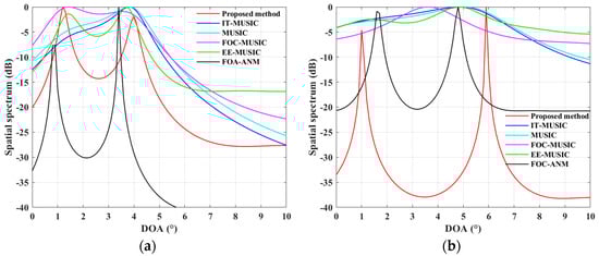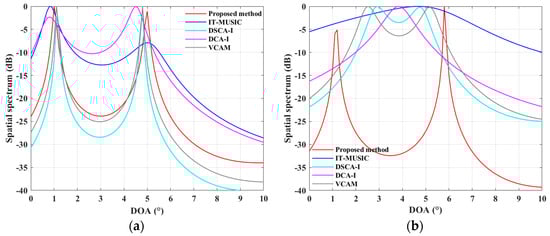 Similarly, numerical examples demonstrating estimation effectiveness are first provided. In scenario (a), the directions of arrival are , and, in scenario (b), they are , both within a beamwidth, making them challenging to distinguish. In both scenarios, SNR = 10 dB, with both the proposed method and IT-MUSIC extending virtually to 25 array elements. For the given physical array, the DCA-I method can perform virtual interpolation on the difference co-array with 25 elements, including holes, subsequently smoothing it into a dimensional array covariance for parameter estimation. The VCAM method generates a virtual DSCA with continuous lags containing 45 elements, after smoothing, forming a dimensional array covariance for parameter estimation. For the DSCA-I method, virtual interpolation is performed on a virtual DSCA containing 49 elements with holes, and, after smoothing, a dimensional array covariance is formed. Figure 11 shows the spatial spectra for the different methods. In scenario (a), each method generally displays significant spectral peaks leaning towards the true directions of arrival, with the proposed method having more pronounced and sharper peaks closer to the true values. In scenario (b), some methods fail to provide effective estimates or even show blurred spectral peaks, yet our method still achieves effective differentiation close to the actual directions of arrival.