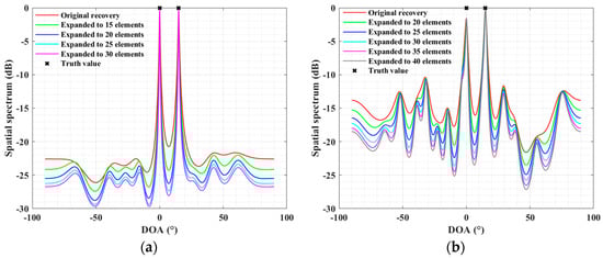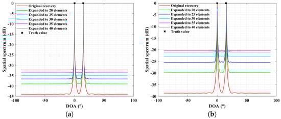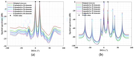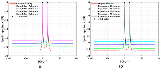 Figure 12 and Figure 13 show the Capon and MUSIC spectra for two scenarios of the proposed method under varying numbers of virtual expansion elements, where the DOAs for both scenarios are with SNR = 10 dB. The term “Original recovery” in the figures refers to the covariance of the SLA reconstructed to the ULA with the same aperture as the SLA using the proposed method, similar to the SPA method for sparse arrays [29]. In scenario (a), repeated experiments typically demonstrate that as the number of virtual expansion elements increases, the Capon spectrum tends to show a regular pattern of increased main-to-side lobe ratio and narrower peaks, while the MUSIC spectrum consistently exhibits sharper peaks and more level peak intervals, indicating a saturation trend with a bounded extension. The increase in the virtual aperture generally aids in enhancing resolution capabilities. It is noteworthy that, in scenario (b), across multiple experiments relative to scenario (a), the spatial spectra do not necessarily show orderly variations with the increase in virtual elements as illustrated. The Capon spectrum may present significant spurious peaks, and the reconstructed virtual covariance might display slightly pathological solutions, not always showing the expected regularity in main-to-side lobe ratio enhancement and peak narrowing with more virtual elements. This occurs due to signal correlation within the constructed atomic set (see Appendix C), where independence among signals is presumed but may not be guaranteed under low snapshot conditions, and actual element positioning can also impact accurate sparse recovery [23,29]. However, the subspace-based MUSIC estimation, due to its inherent robustness, does not display spurious peaks and maintains a degree of regular variation. Overall, increasing the number of virtual elements does contribute to enhancing resolution to some extent.