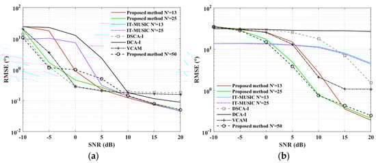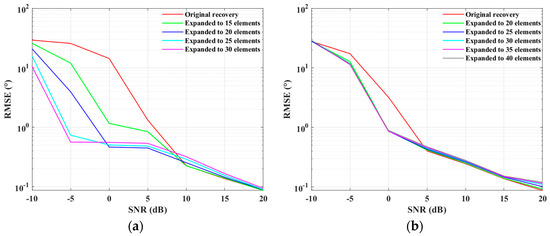 We further conducted the RMSE versus SNRs experiment under different virtual extension elements for the proposed method. The simulation conditions remained the same as in the first experiment of this section, with SNR increasing from −10 dB to 20 dB in steps of 5 dB. For each SNR, 300 Monte Carlo experiments were performed. The results of the RMSE versus SNRs are shown in Figure 14. It can be observed that under both scenarios, as the number of virtual elements increases, there is a lower SNR threshold for effective estimation, indicating an improvement in the virtual aperture, which is particularly evident in scenario (a). Of course, after a certain stage of virtual expansion, the RMSE during effective estimation tends to increase, suggesting that there are limitations to the virtual expansion of the proposed method. In scenario (b), increasing virtual elements generally shows a lower SNR threshold, but it does not follow a regular trend like in scenario (a).