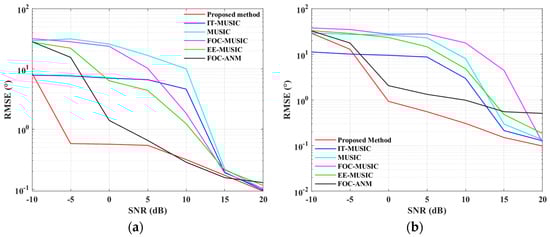 It is observed that with the increase in SNR, the trend of each curve is decreasing, especially after a certain SNR level. In any case, the method we propose consistently exhibits a lower RMSE. The FOC-ANM method shows sub-optimal performance in the effective estimation range for scenario (a) and even outperforms the proposed method within a certain SNR range, with its curves flattening at very high SNR levels in both scenarios. This is because the method calculates the FOC matrix from array output data, vectorizes it after redundancy removal as an SMV model, and solves it using the atomic norm method. Even though it extends the aperture and maintains the excellent estimation performance of atomic norm-based methods, the error tolerance of the FOC matrix estimation is not considered [47], leading to this phenomenon, which is particularly evident in scenario (b), where the shortage of snapshots increases the error in estimating the FOC matrix. Furthermore, FOC-based methods generally require a large number of snapshots and high SNR for better estimation performance, and the number of snapshots in the simulation is still quite limited, resulting in the FOC-MUSIC method not performing well in both scenarios. For EE-MUSIC, since its extrapolation factor is derived from the intrinsic linear relationship of the received data, it is affected by the number of snapshots and noise, and the power of the data from the extended elements degrades as more virtual elements are added, no longer benefiting estimation performance after a certain range [40], making this method perform poorly in both scenarios. For IT-MUSIC, which is used to derive the mapping for expansion, this mapping results in the coloration of noise after expansion. Even though pre-whitening techniques might improve this, the virtual steering vectors obtained from the mapping are still affected by the scope and granularity of sector division [41,43]. This limits the estimation performance in practical applications and is generally not utilized for virtual array expansion. Our sector is set from −10° to 10°, with increments of 0.1°. From the figures, it is evident that this method remains in a steady state of ineffective estimation at medium to low SNR. In contrast, the method proposed in this paper achieves better estimation performance through appropriate virtual extension, with a lower effective DOA estimation threshold compared to other aperture extension methods, especially in scenario (a) at high SNR, where the estimation performance with only 30 virtually extended elements approaches that of 37 elements in FOC-ANM.