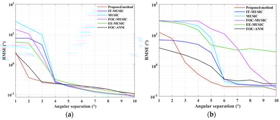 In the final part of this section, Figure 10 presents the RMSE versus the angular separation results, where the arrival directions are , with increasing from 1° to 10°, SNR = 10 dB. For each , 500 Monte Carlo experiments are run, with the rest of the simulation conditions remaining the same as before. From the figures, it can be seen that our method can better enhance resolution at smaller angular separations compared to other aperture extension methods. In scenario (a), for angular separations less than 3°, the estimation performance is better compared to others, and, for separations greater than 4°, it converges with MUSIC and outperforms others, especially in scenario (b), where it can effectively resolve angles greater than 3° and consistently has a lower RMSE.