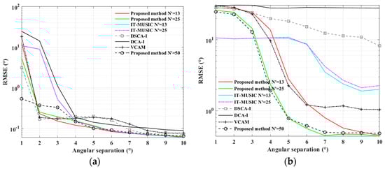 RMSE versus angular separation for ULA case: (a) when ; (b) when .