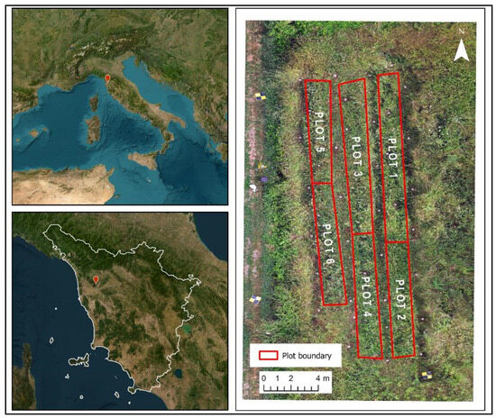 Site location in Italy (upper left) and Tuscany (lower left) represented by the red dots; the image on the (right) shows the position and size of the six analyzed plots.