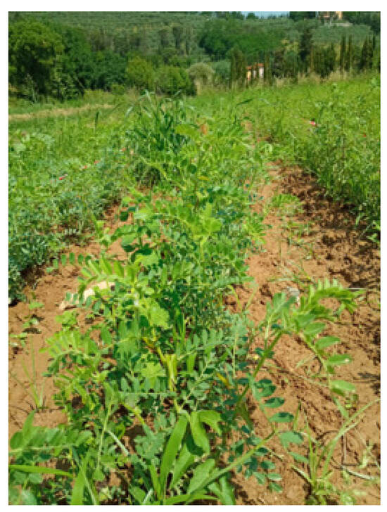 The experiment was conducted in a chickpea crop field at Meristema Srl (located in Buti, Tuscany, Italy, Figure 1), where no mineral fertilizers, pesticides nor herbicides were added. The same applies for the surrounding proximal areas, meaning that the possibilities of external contamination are to be considered very negligible. Chickpea seeds were sown on 15 April 2023 in a soil characterized by 26% clay, 37% sand and 3.3% organic matter [8]. When plants reached the fifth node stage (approximately 30 days after sowing), 6 experimental plots (1.5 m × 7.5 m) were selected, containing 20 plants each (Figure 1 and Figure 2). Following a randomized complete block design, in half of the plots, plants were both foliar sprayed weekly and fertigated every 2 weeks with WD. The other half were treated in the same way but using tap water only (i.e., control, C). Before application, WD was diluted in tap water at 0.2% (v/v) for foliar treatments and at 0.3% (v/v) for fertigation ones, according to the producer’s instructions. The volume of treatment applied varied according to the plant growth stage, ranging from 100 to 250 mL per plant. Plots were separated by a row of untreated plants.