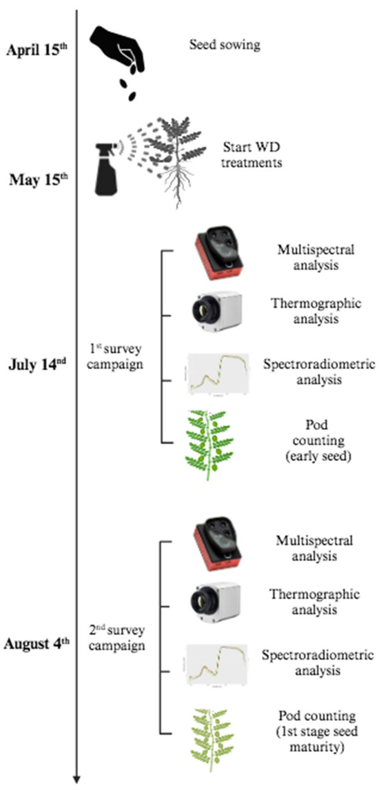 However, while the effects of WD on seed yield are well documented, the influence of WD on the plant at pre-harvesting stages has not been investigated yet. These stages can indeed provide critical insights into the early involvement of WD in determining final seed yields, ultimately allowing for proactive measures in managing plant health and optimizing growth conditions to ensure crop health. In this context, high-throughput field phenotyping techniques, including multispectral and thermographic analyses, are particularly suitable for the determination of plant health at pre-harvesting stages. These approaches can provide continuous, non-invasive monitoring of plant development and, hence, realistic insights into the dynamic nature of crop performance in agricultural settings [11,12,13]. For example, multispectral analyses and the calculation of vegetation indices, such as the Normalized Difference Vegetation Index (NDVI), have been previously used to phenotype the potential yield of different legume plants, including pea and chickpea [12,14], as well as to assess disease severity in chickpea caused by the fungal pathogen Ascochyta rabiei [15]. Moreover, thermographic analyses have been previously used to evaluate the index of stomatal conductance among different chickpea genotypes [16] as well as to evaluate the germination capacity of pea seeds [17]. Hence, these non-destructive approaches could provide important insights on the bio-stimulatory effects of WD on chickpea at pre-harvesting stages, allowing farmers to optimize field management strategies (e.g., biofertilizer/biopesticide application or irrigation scheduling), especially during periods of harsh conditions.