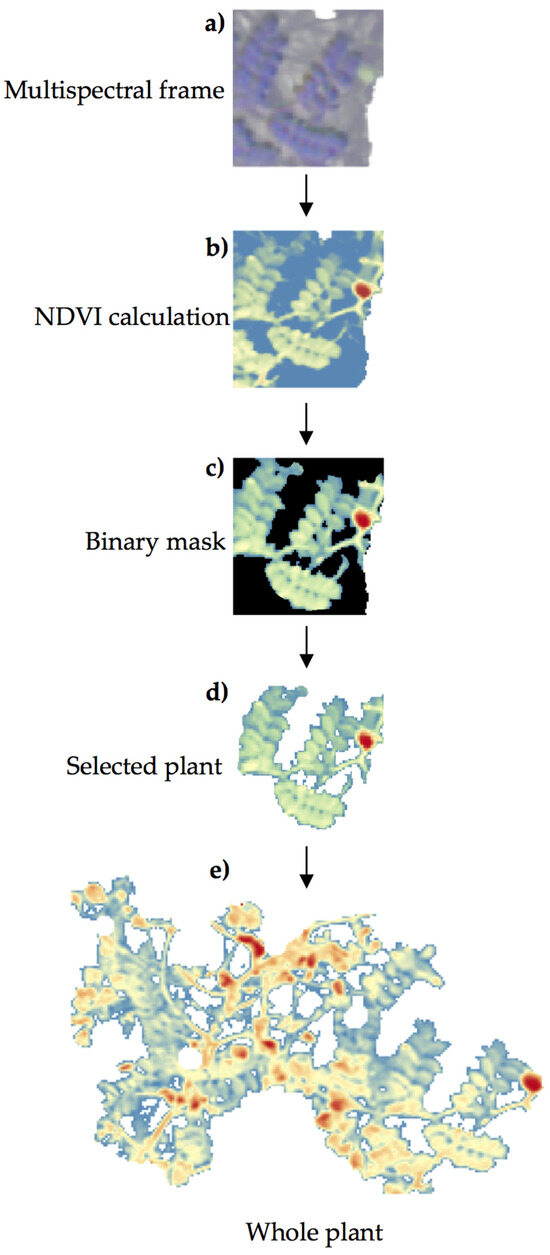 Procedure for NDVI calculation in chickpea plants: (a) detail of a selected chickpea plant from the multispectral image; (b) calculation of NDVI in the selected plant; (c) application of a threshold to create a binary mask; (d) generation of a new raster layer containing the selected plant and its associated NDVI value; (e) aspect of the whole plant at the end of the image processing.